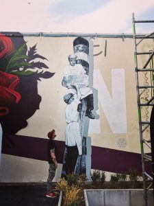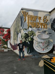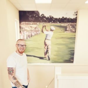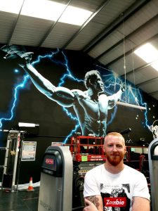 I also work as a professional large-scale mural and portrait painter, working alongside the We Are Culla street art team. I’ve painted many murals around Staffordshire including a 10m wide Arnold Schwarzenegger portrait at Basebody fitness in Park Hall, a large painting of legendary golfer Ben Hogan at Goin’ Golf in Longton and several brushwork pieces as part of the stunning War Memorial mural in Longton town centre. I was also one of three artists chosen to hand paint the new Nemesis Reborn ride at Alton Towers, and I created a large fan mural at the old stadium area for Manchester City FC.